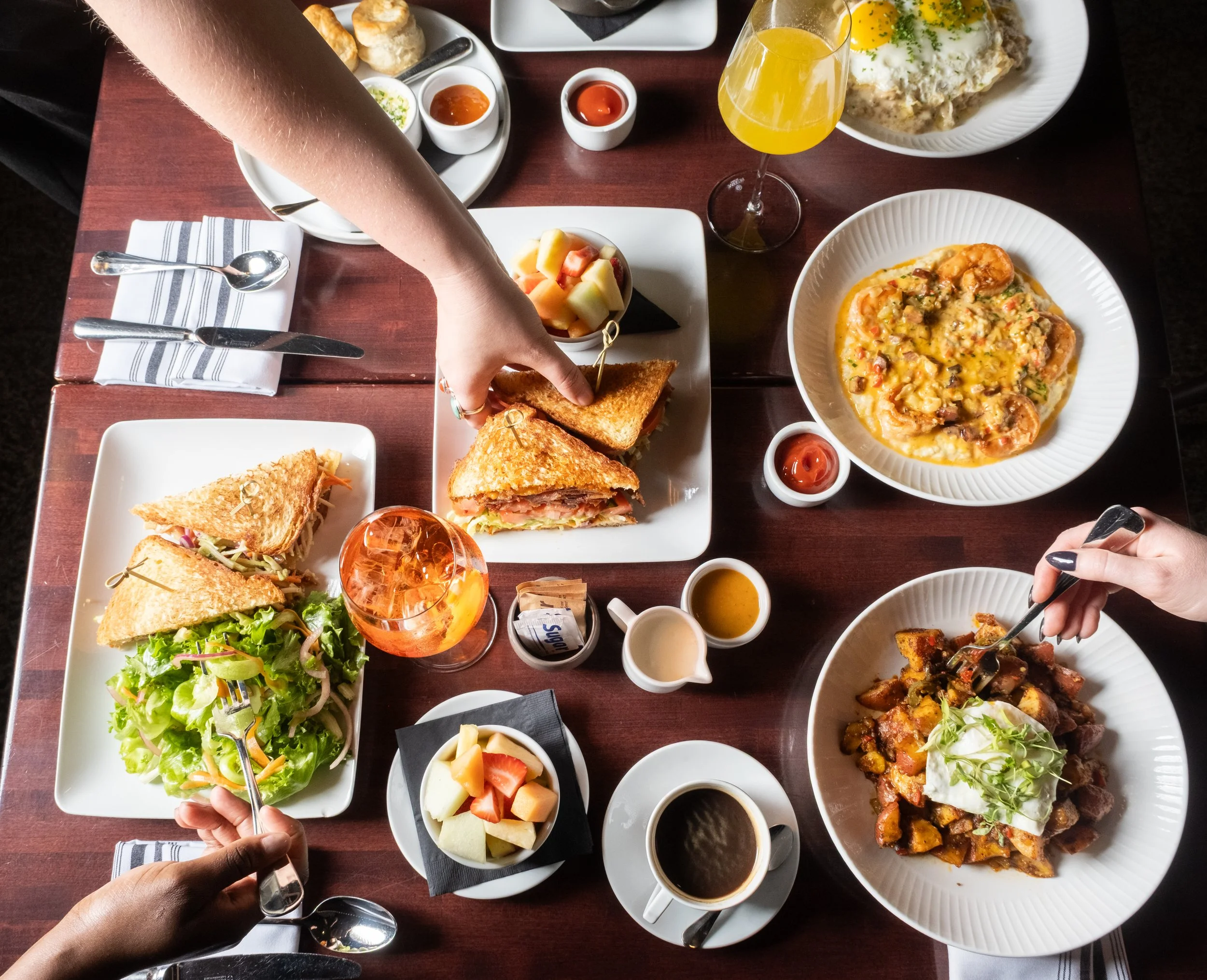 sausage or bacon, marinated tomatoes, grits, potatoes, two eggs